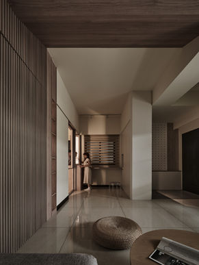 The dining and kitchen area features a glass-wood design for the kitchen sliding door to block kitchen fumes, extending the visual axis of the living room and the entrance hallway. Through the interplay of light and shadow, a special angle and narrative context are created.