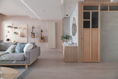 In this multi-layered space, the original enclosed layout is redesigned. The public area is transformed into the piano room, study room, living room, and dining room along the path of light. The interplay of light and shadow also contributes to creating a place for gathering and enjoying each other's company. The entire space features wood hues with a base of pink gradient. The neat and shallow lines offset a sense of separation brought by the long and narrow layout and create a sense of visual movement and flow.