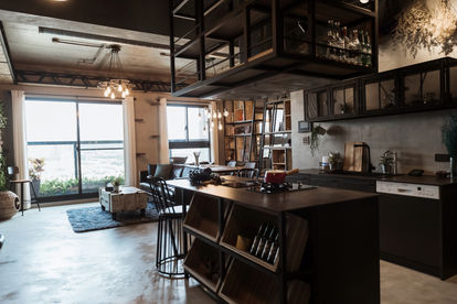 The homeowners consider the cat to be their furry family member. The main design axis of the loft is casualness. The open-concept spaces give an unobstructed view so that the cat and homeowners can interact more with each other. In the dark-colored home, not only homeowners but also the cat can find a place to relax and rest. The rough texture of industrial style is expressed through iron pieces, leather sofa, and exposed pipelines, while the warm light evokes the feeling of nostalgia and tells the story about the home. The hand-painted texture spreads over the ceiling, floor, and wall to slowly reveal a rustic warmth that balances the coldness of the industrial style. Nature is brought indoors by adding plants at the windows, kitchen, and dining room. As a result, the rigidness of space is soften. Without featuring a grey tone, the TV wall is in a highly saturated blue with multiple layers of smears creating various shades. A cat jumping platform is perfect for the couple’s perching and climbing feline family member. It also connects upward to the aerial walkway in the shape of a crane, creating a personalized scene in a balance of movement and stillness. In the kitchen and dining room, the kitchenware is placed on the kitchen island to allow interaction between the family and pet while cooking. The charcoal-black pendants and countertops subdue the ambience and exude a stable and relaxing dining atmosphere. At the sides of the bar attached to the kitchen island, wooden cabinets are placed to store beers from different countries. The brilliant colors make the room look active and alive. A book wall divides the public sphere and private sphere. The clever arrangement of books provides privacy to the bedroom. Wood accents in the interior of the bedroom add warmth and create a tranquil and soothing feeling.