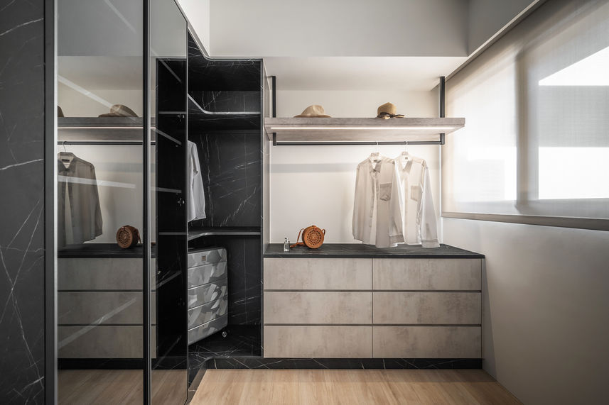 In the interior space, the designer has taken a thoughtful look at the limited space available and carefully crafted an open design that seamlessly integrated the guest room and dining area in a way that felt both spacious and inviting. One of the key elements of the layout was the clever connection between the shoe cabinet, display cabinet, and TV wall, which created a more fluid and open feeling throughout the space. On the other hand, to enhance privacy and maintain a comfortable environment, the designer strategically employed glass sliding doors in the kitchen and private area. These doors not only separate the two spaces effectively but also prevent kitchen fumes from permeating throughout the room. Additionally, they help to maintain privacy and prevent the cool air from the air conditioning from getting out, ensuring a cozy and comfortable atmosphere for all. In order to maximize storage space, the designer ingeniously created a multi-functional dressing room in an otherwise unused area. This adds both functionality and style to the room, providing a unique and practical solution to the challenge of limited space. Moving into the master bedroom, one will notice that the designer has opted for warm, inviting wood tones and rustic metal accents to create a cozy and intimate atmosphere.