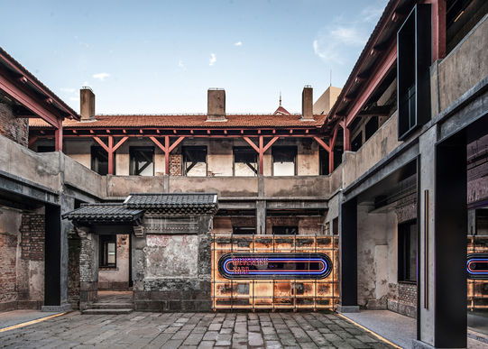 The easternmost courtyard stimulates vitality with altruism. The exterior facade of the building is only decorated with few modern metal elements and modern lighting fixtures on the wall. The ground still retains the original traces of time on the bluestone slab. Let people in the store feel the spatiotemporal dialogue brought by two spaces through various windows and frames.