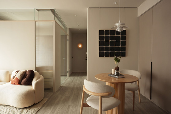 The name of the project, "Spring Buds", comes from the gentle tone of the space and the creamy main visual. 66.1 square meters of the small apartment, the design team injected the aesthetics of the wabi-sabi style into it. They took a creamy tone as the main visual and curves to connect all the corners to bring in natural light, shaping a warm and cozy home for the newlywed couple.