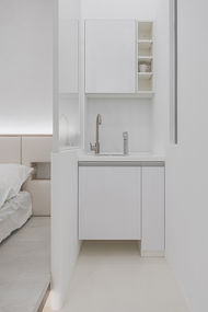 The late German-American architect Ludwig Mies van der Rohe once said, “Less is more.” The designer of this interior design project has adopted a minimalist design approach, creating a neat, simple and sharp spatial presentation. In addition, the designer has taken the space capsule as the core concept for this project by setting white as the primary color scheme. With a rounded design to decorate the details and lines to outline the space, the residence has turned into a lovely living environment that makes people feel like they are in a space capsule full of a futuristic and high-tech-ish vibe. As soon as entering the residence, one will be amazed by the freshness that the white color configuration has expressed in the space. The space is tranquil, enjoyable, and beautiful. As for the walls, they are white lacquered and made of glass and mineral art paints. Besides, the designer has stayed consistent with the same color yet different material textures to bring the spatial sensation and multiple layers. For the TV wall, metal plates are utilized to add a touch of technology. The mineral art paint on the back wall of the bed resembles the moon’s surface, transforming the bedroom into a space capsule next to the moon so that the residents can enjoy an outer space experience. For the bed area, the designer has planned an elevated floor and indirect lighting to create a sense of floating, illustrating the outer space scenario and concept well. In the open living area, the designer has utilized the curves of the circular walls and the setting of screens to define distinct living spaces. For this project, the designer has set a simple style as the main spatial focus and has thoughtfully designed a sitting area, sink, dressing table, closet, TV wall, and other functional configurations to meet the residents’ daily needs, routines and habits.