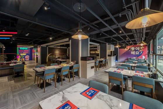 "Newtro" is a portmanteau of the words "new" and "retro" and refers to the trend of "modernized retro.” It is a trend sweeping through the youngster community in South Korea. Also, it is a reinterpretation of retro and nostalgic design style, also known as the Korean version of "youth culture.” For this project, the design team brilliantly injected the idea of Newtro culture into the space, integrating the new trendy and retro elements to demonstrate a unique Korean restaurant style. As "Newtro" is a product of multi-dimensional fusion, it takes effort and careful planning to reach a perfect balance. With the delicate design techniques, the design team has planned the light wood veneer and iron parts to decorate the beams to create a picture of the historical wooden house. Besides, red bricks and tiles are utilized to bring the feeling of nostalgia. At the same time, titanium plating and iron parts produce a new fashion style, presenting a harmonious and refreshing space for diners. Standing outside the store, one could look through the large floor-to-ceiling windows and appreciate the store’s style. The facade is constructed with geometric shapes, and the eaves are shaped with titanium-plated material, looking unique and sharp. Upon entering the store, one will be greeted by a photo booth wall with the 3D concept to visualize the brand's ICON. The wall combines Korean graphics with neon lighting to intertwine the three-dimensional and flat patterns, creating a vivid tone and sense of layers. The designer stays consistent with titanium-plated metal, laminates, and PVC flooring for the counter. Above the counter, prominent three-dimensional characters are set with disorderly creative lines to demonstrate a distinctive and impressive visual expression.